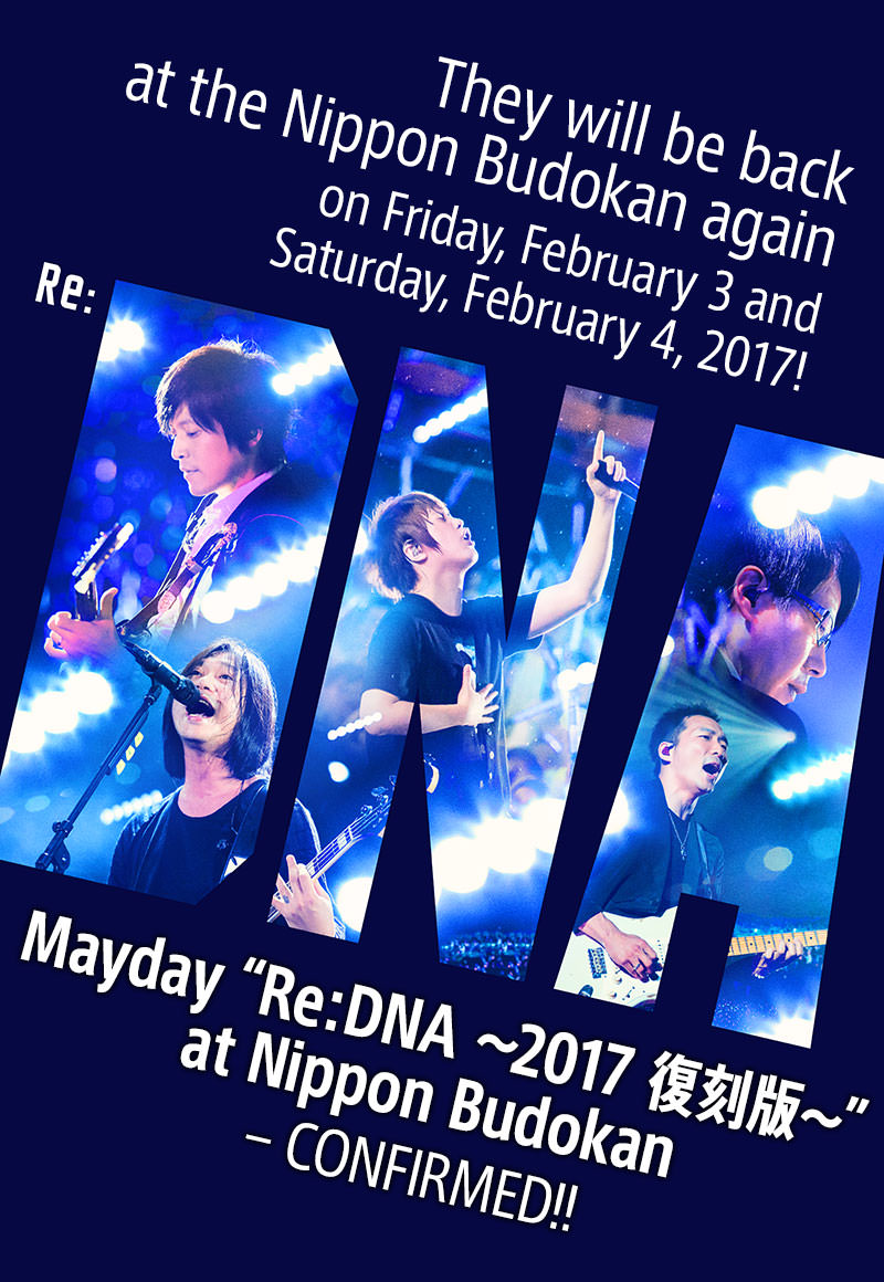 Mayday is determined to challenge themselves, and will be back to the Nippon Budokan again in February 2017 with the concert titled “Re: DNA 〜2017復刻版〜”.