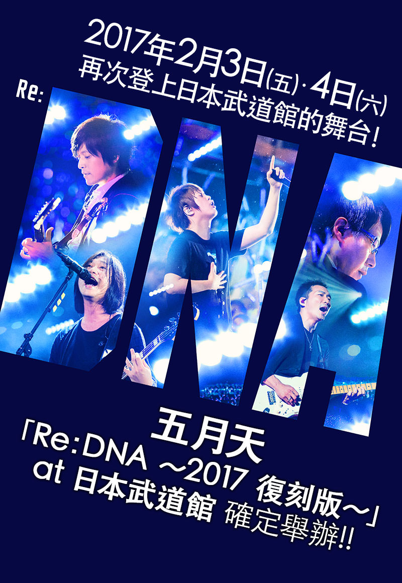 2017年2月在東京日本武道館,五月天決定自己挑戰自己,以「2017復刻版Re:DNA」五月天重回日本武道館演唱會。也請期待,在日本發行的新專輯「自傳 HISTORY OF TOMORROW」日本版中的日文新樂曲之首次曝光!